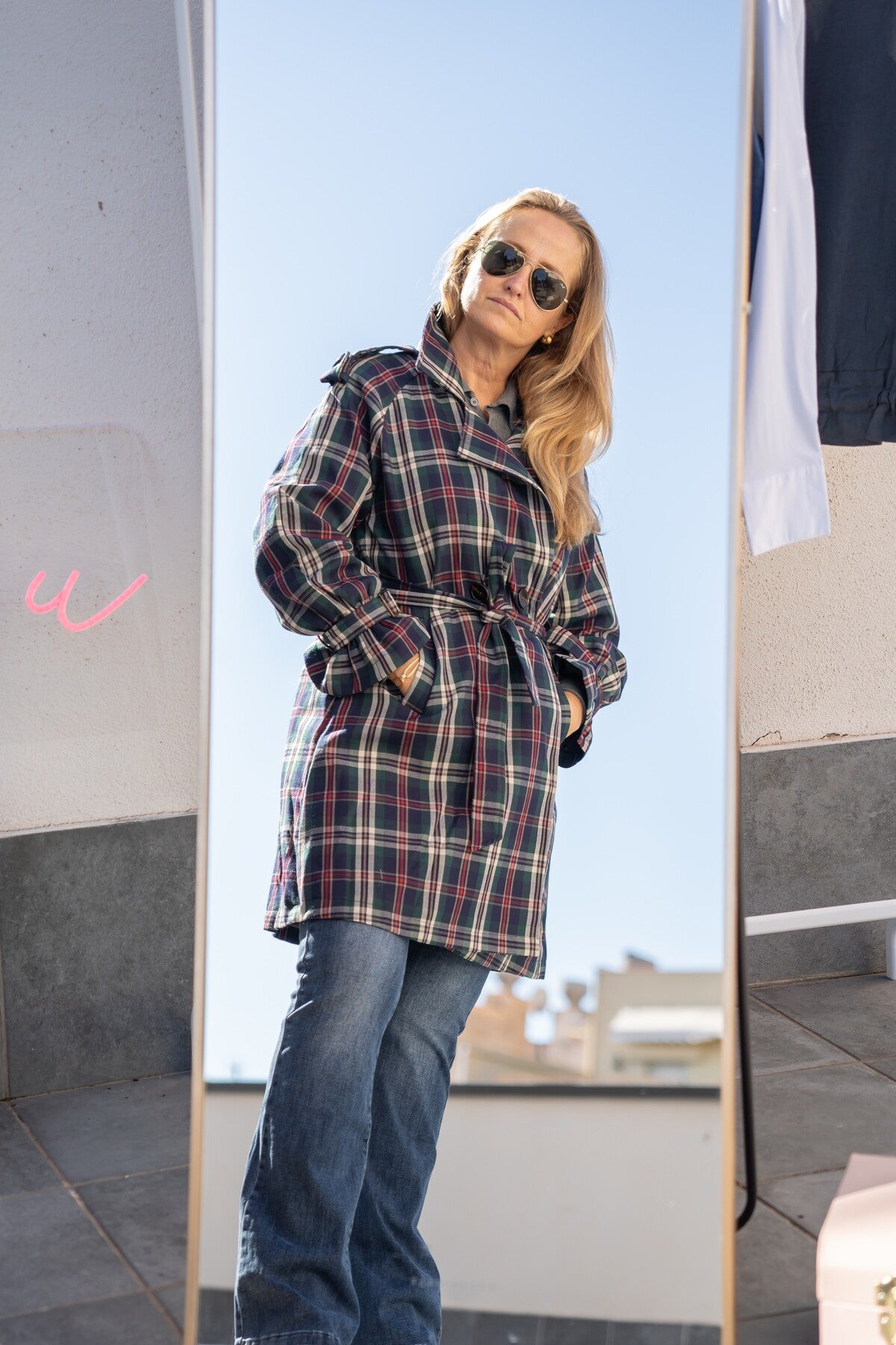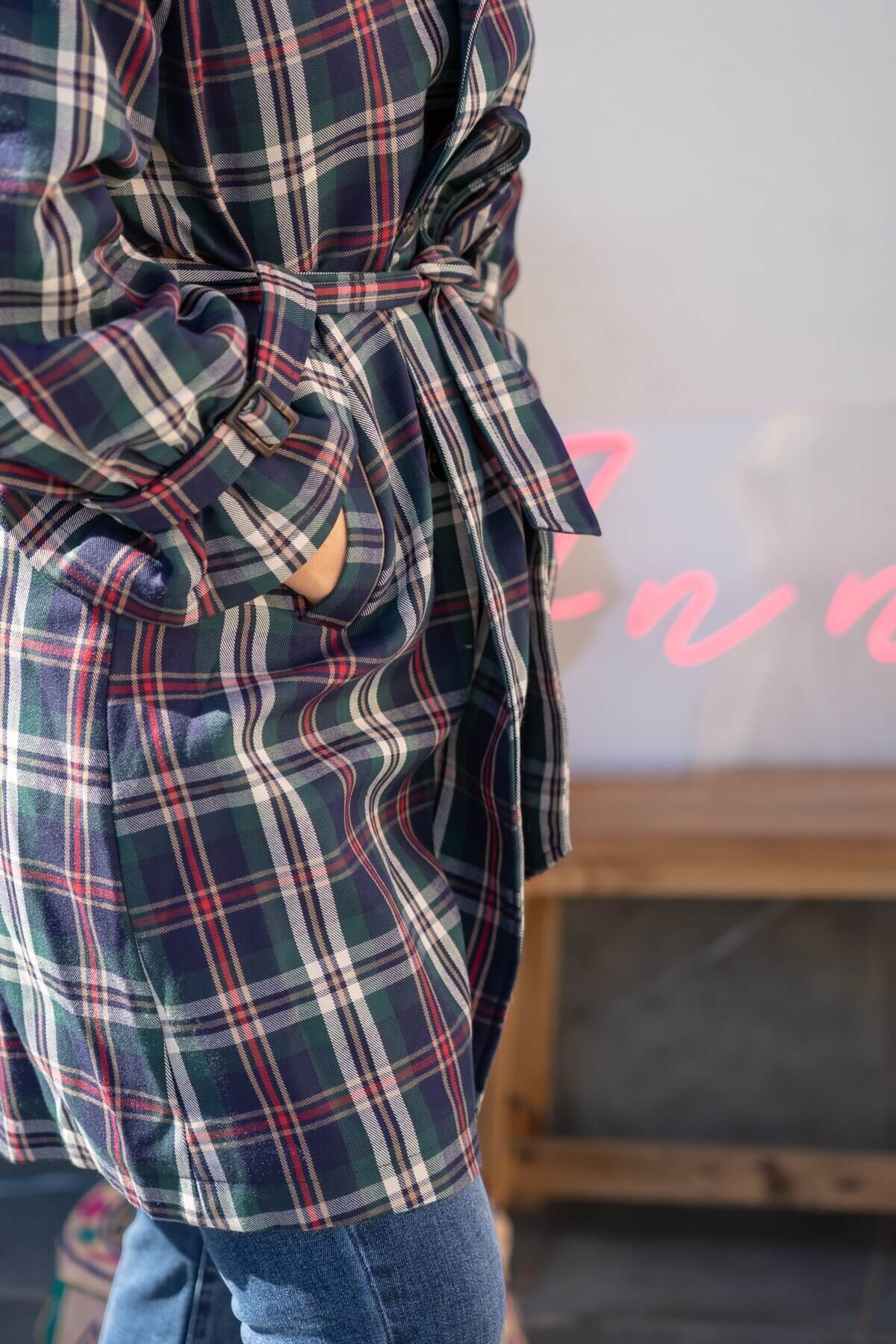 El estampado de cuadros, en tonos profundos y atemporales, le da ese aire británico renovado que nunca pasa de moda. Su diseño con cinturón a juego permite ajustarla a la cintura para un look más femenino, o llevarla abierta para un estilo más relajado. Los bolsillos amplios añaden practicidad sin perder elegancia.