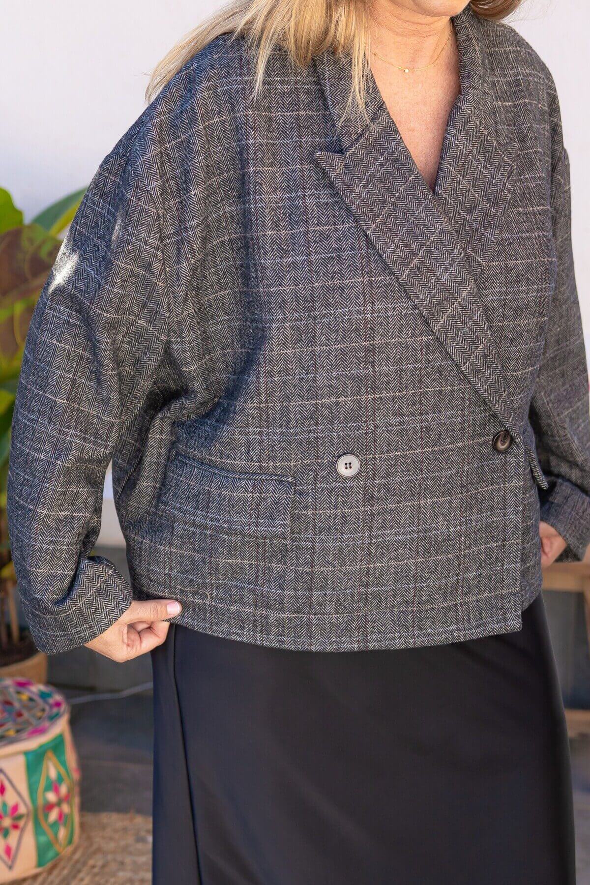 Chaqueta oversize en color gris con dibujo de finos cuadros. Doble botonadura. Talla única.