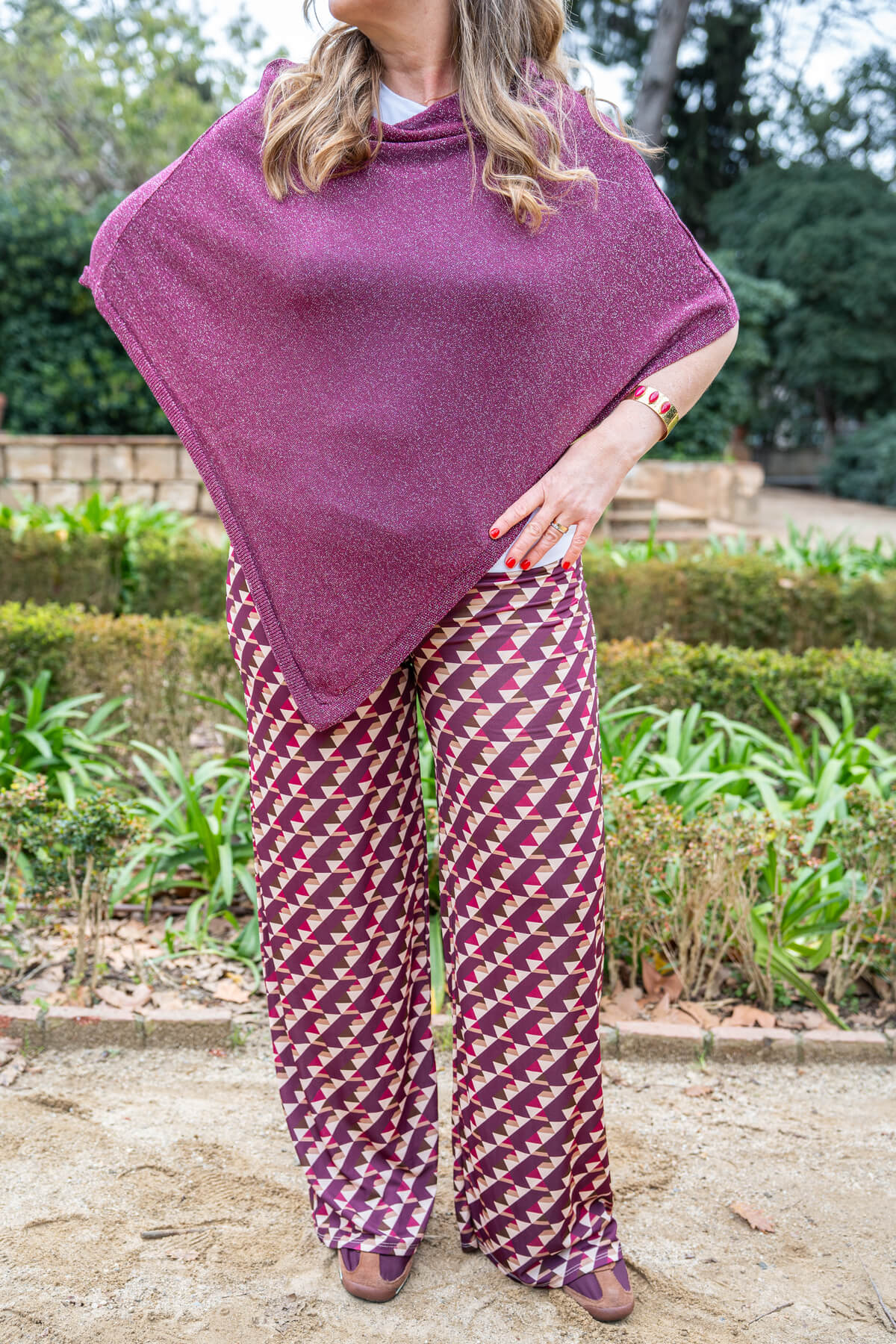 El Pantalón Prisma es de esas prendas que no pasan desapercibidas. Su estampado lleno de ritmo y color lo convierte en el aliado perfecto para transformar un look sencillo en uno con mucha presencia. Combínalo con una blusa blanca fluida, un top ajustado o incluso un jersey de punto fino para los días más frescos. ¿Te atreves con el mix and match? Póntelo con la capa de lúrex de AnnFou para un total look.