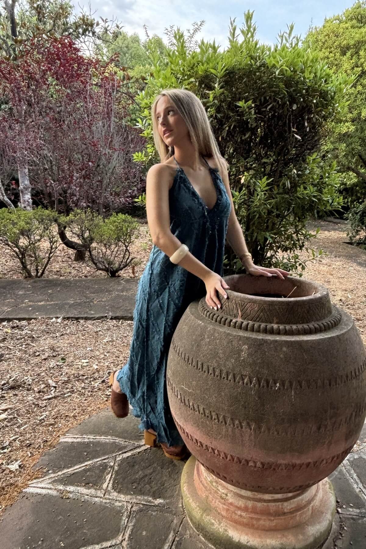 Disponible en dos tonos irresistibles —azul petróleo y rosa empolvado—, su escote en V y la espalda descubierta le dan un aire femenino, fresco y sensual. Detalles de hilos dorados que iluminan discretamente la prenda y le dan ese toque bohemio y a la vez sofisticado.